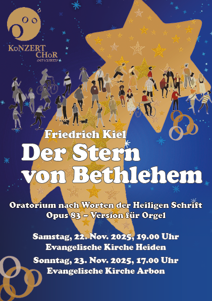 Am 22. und 23. Nov. 2023 führte der Konzertchor Ostschweiz in Heiden AR und Arbon das kaum je aufgeführte Oratorium Der Stern von Bethlehem von Friedrich Kiel auf, ergänzt durch Die Weihnachtslieder op. 8 von Peter Cornelius (1824 – 1874) und Orgelimprovisationen.